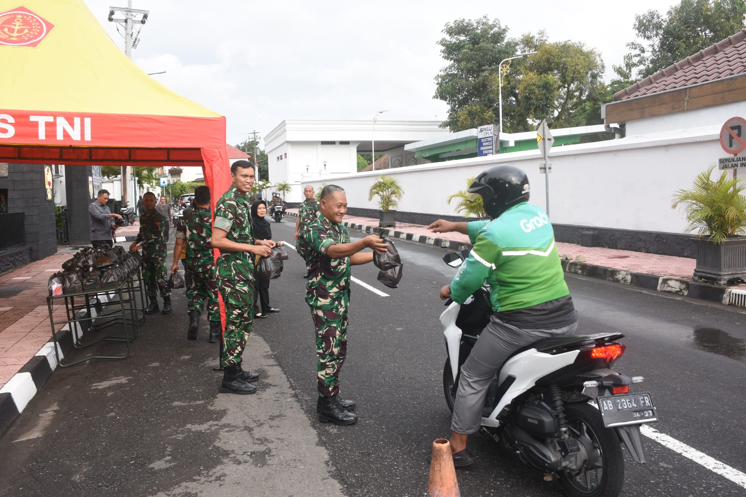 Senyum ramah terpancar dari para prajurit Korem 072/Pamungkas saat menyapa warga sembari menyerahkan takjil berbuka puasa.