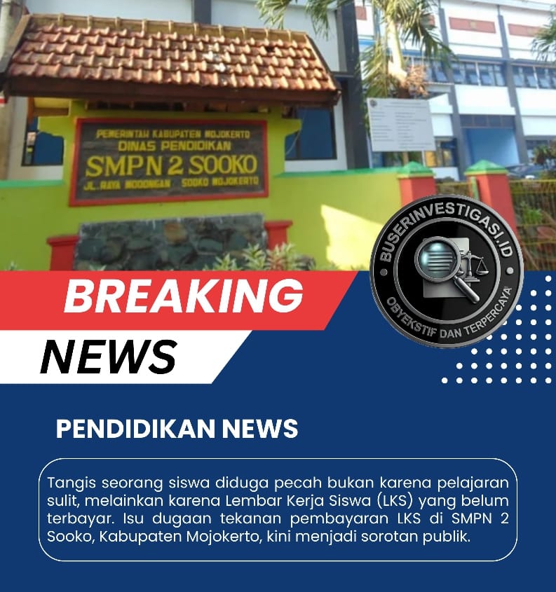 Mojokerto – Dugaan praktik penekanan pembayaran Lembar Kerja Siswa (LKS) kembali mencoreng Dunia pendidikan Negeri. Kali ini, sorotan Publik tertuju pada SMPN 2 Sooko, Kabupaten Mojokerto.