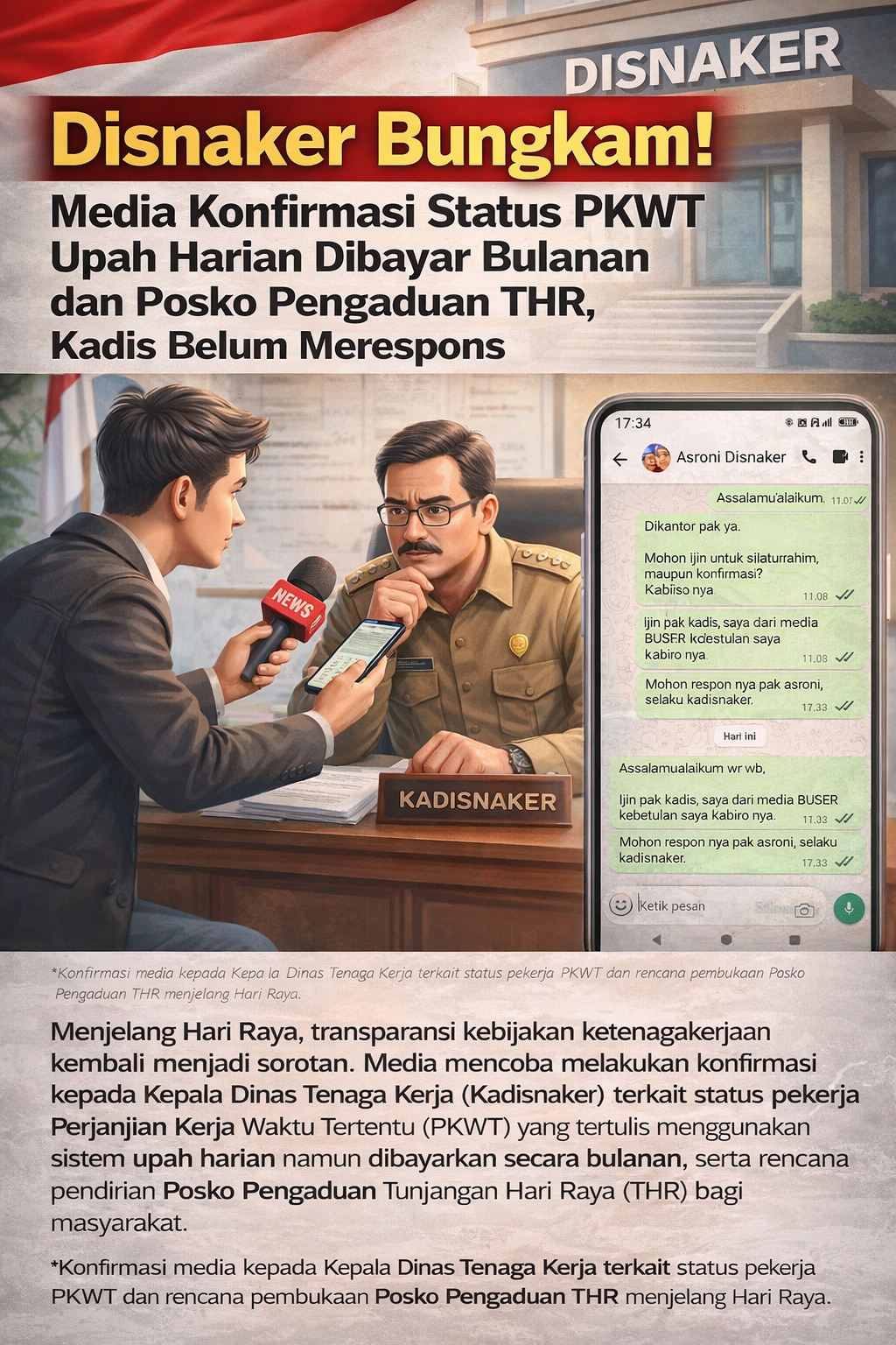 Media mencoba melakukan konfirmasi kepada Kepala Dinas Tenaga Kerja (Kadisnaker) Kabupaten Sampang Jawa Timur terkait status pekerja Perjanjian Kerja Waktu Tertentu (PKWT) yang tertulis menggunakan sistem upah harian namun dibayarkan secara bulanan, serta rencana pendirian Posko Pengaduan Tunjangan Hari Raya (THR) bagi masyarakat. Kamis – Sabtu, (13-15/3/2026).