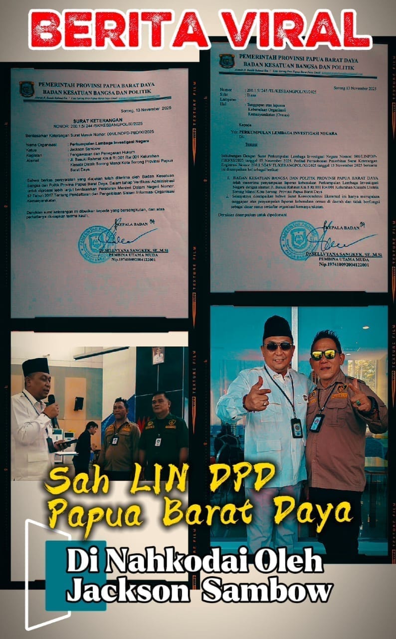 Papua Barat Daya — Ketua DPD Lembaga Investigasi Negara (LIN) Papua Barat Daya, Jackson Sambow, menyampaikan apresiasi dan terima kasih kepada Badan Kesatuan Bangsa dan Politik (Kesbangpol) Papua Barat Daya atas diterbitkannya Surat Keterangan (Suket) untuk DPD LIN Papua Barat Daya.