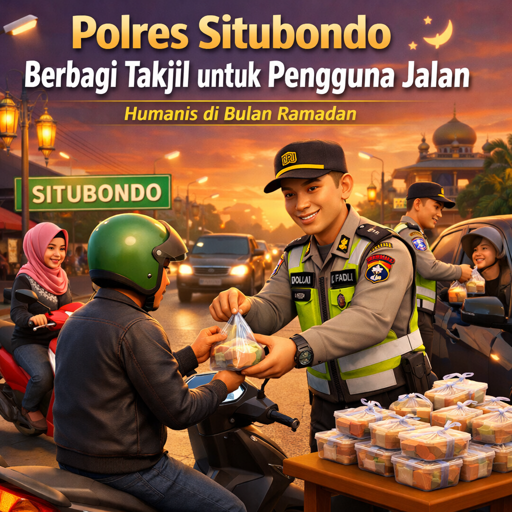 Kegiatan tersebut dilaksanakan di Jalan Tembus Baru Kotakan, Kabupaten Situbondo, menjelang waktu berbuka puasa. Puluhan personel Satuan Samapta Polres Situbondo turun langsung ke lapangan untuk membagikan ratusan paket takjil kepada pengendara roda dua maupun roda empat yang melintas di jalur tersebut.