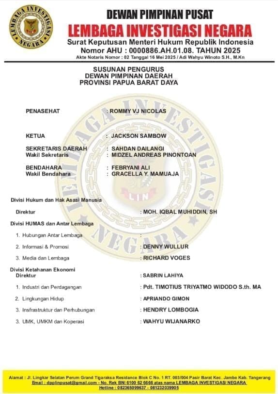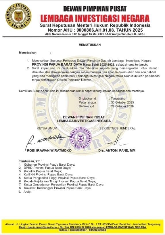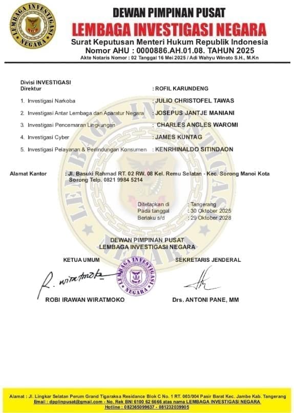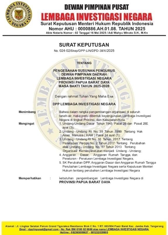 Keputusan tersebut tertuang dalam Surat Keputusan Nomor: 024-02/Skep/DPP-LIN/DPD-38/X/2025, ditandatangani langsung oleh Ketua Umum Robbi Irawan dan Sekretaris Jenderal DPP LIN pada 30 Oktober 2025 di Tangerang, dan akan berlaku hingga 29 Oktober 2028.