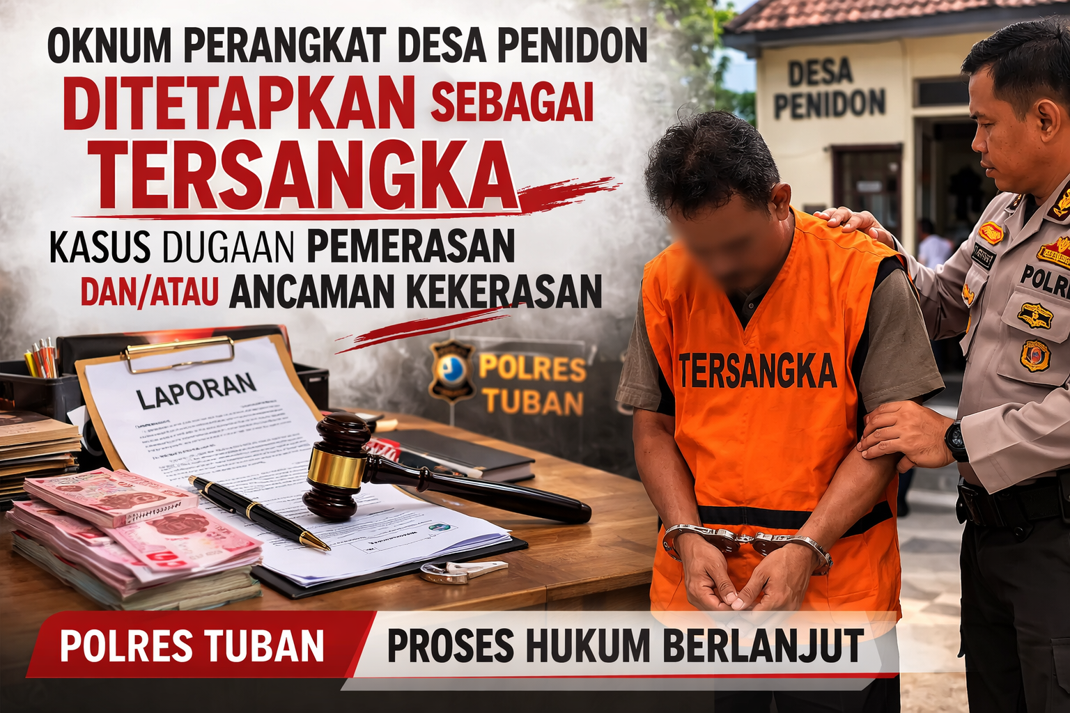 Tuban – Kasus dugaan pemerasan dan ancaman kekerasan yang melibatkan seorang oknum perangkat Desa Penidon, Kecamatan Plumpang, Kabupaten Tuban, kini memasuki babak baru. Jajaran Satreskrim Polres Tuban resmi menetapkan KC (49) sebagai tersangka setelah melalui proses penyelidikan dan penyidikan yang cukup panjang.