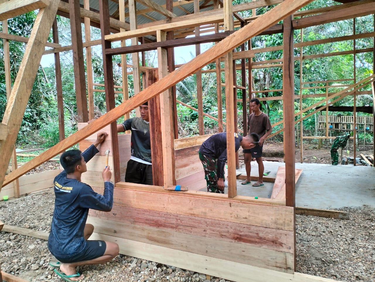 Sejak pagi hari, anggota Satgas TMMD tampak kompak memasang papan kayu satu per satu pada rangka rumah yang sebelumnya telah berdiri kokoh. Setiap papan diukur dan disesuaikan dengan cermat agar terpasang rapi serta memiliki kekuatan yang maksimal. Ketelitian dalam tahap ini sangat penting guna memastikan rumah yang dibangun benar-benar kokoh, aman, dan nyaman untuk ditempati.