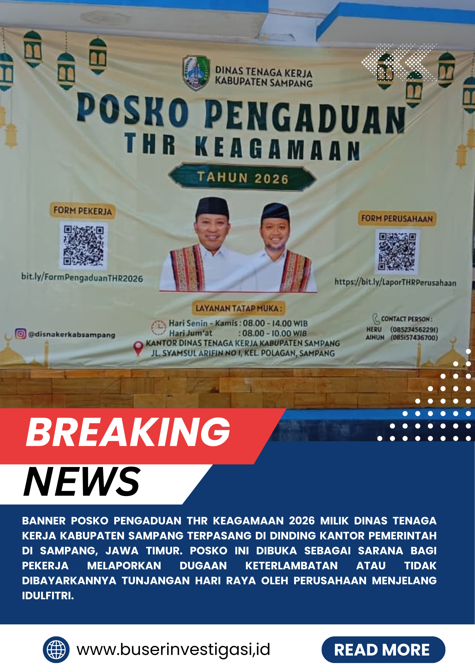 SAMPANG ll buserinvestigasi.id – Pemerintah Kabupaten Sampang melalui Dinas Tenaga Kerja Kabupaten Sampang mengumumkan pembukaan Posko Pengaduan Tunjangan Hari Raya (THR) Keagamaan Tahun 2026 sebagai sarana bagi pekerja untuk melaporkan persoalan pembayaran THR menjelang hari raya.