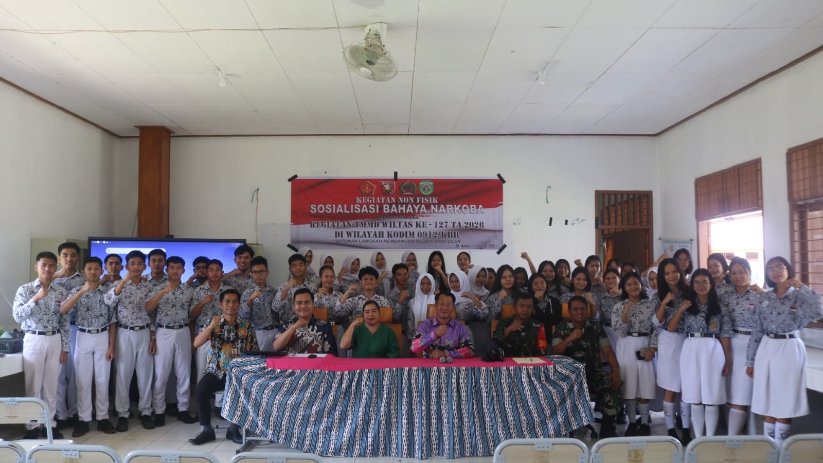 KUTAI BARAT.BUSER INVESTIGASI– Dalam upaya membentengi generasi muda dari ancaman penyalahgunaan narkotika, anggota Satgas TMMD Wiltas Ke-127 dari Kodim 0912/Kutai Barat bersama Dinas Kesehatan Kutai Barat menggelar kegiatan sosialisasi bahaya narkoba bertempat di SMAN 01 Linggang Bigung pada Kamis (26/02/2026).